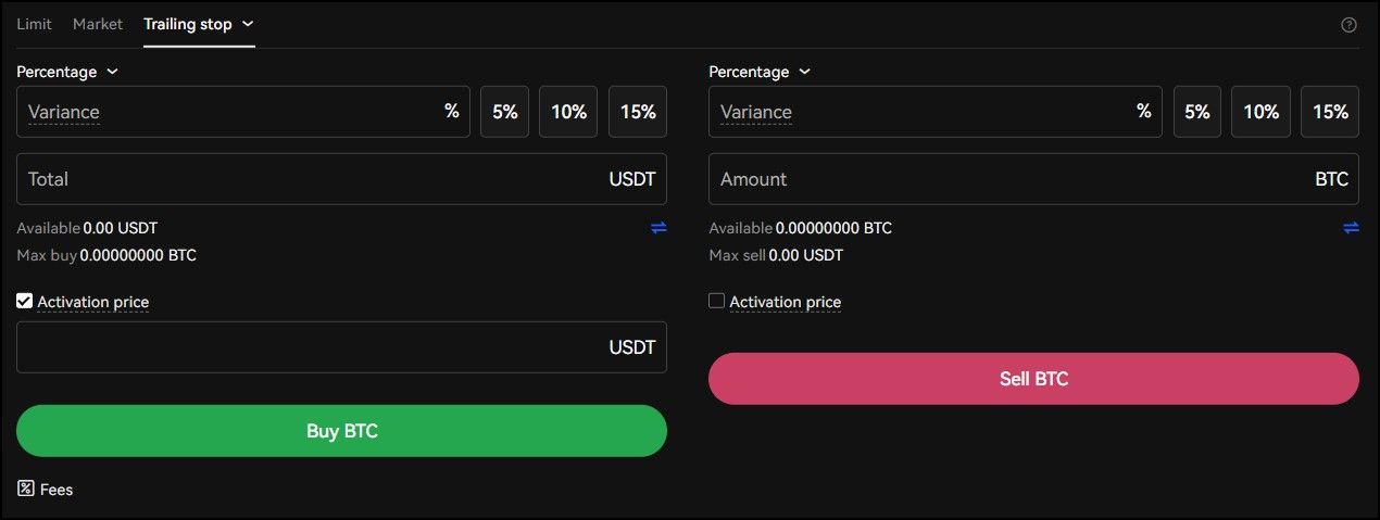 Trailing Stop - A trailing stop order lets you place an order that ‘trails’ the asset price when it is trending in a favourable direction and exits the position of the trend changes direction. The order consists of three values — activation price, variance, and amount.