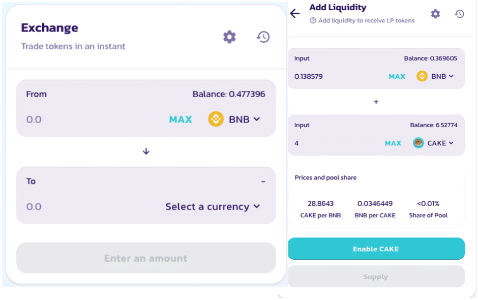 - Get some BNB and CAKE tokens into your wallet with a ratio of 1.1 : 25. If you have one or the other, use the Exchange to help you achieve that ratio. The 0.1 is to help with the gas fees of which there are quite a number, even though the amount is a small one. An exchange between two tokens can easily result in paying gas fees two or three times.