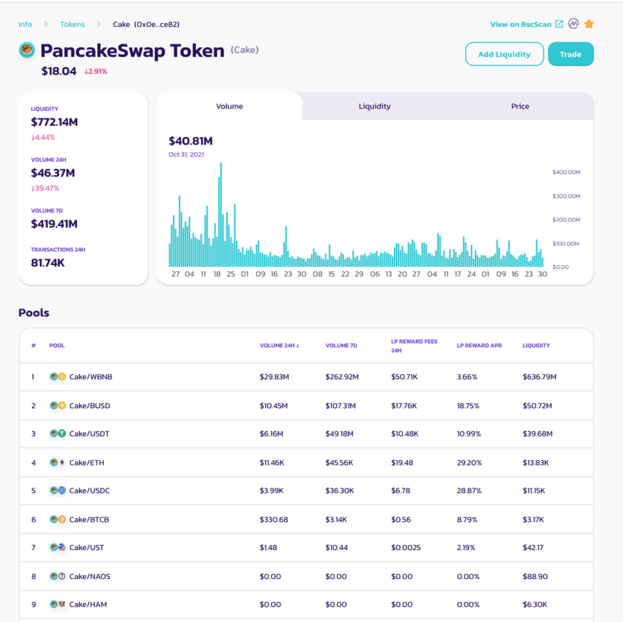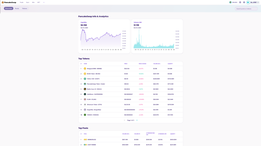 PancakeSwap has their own analytics page to help users gain a clear picture of the state of things in bunny land. These stats are categorised in three ways: Overview, Pools, and Tokens.