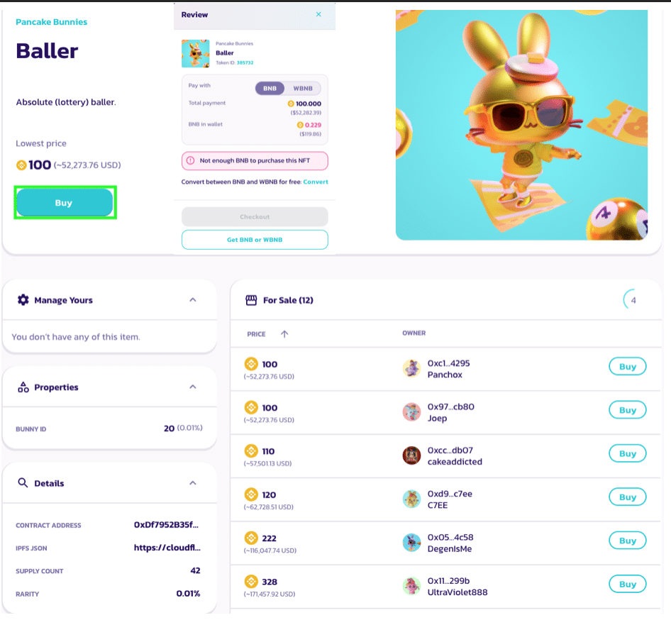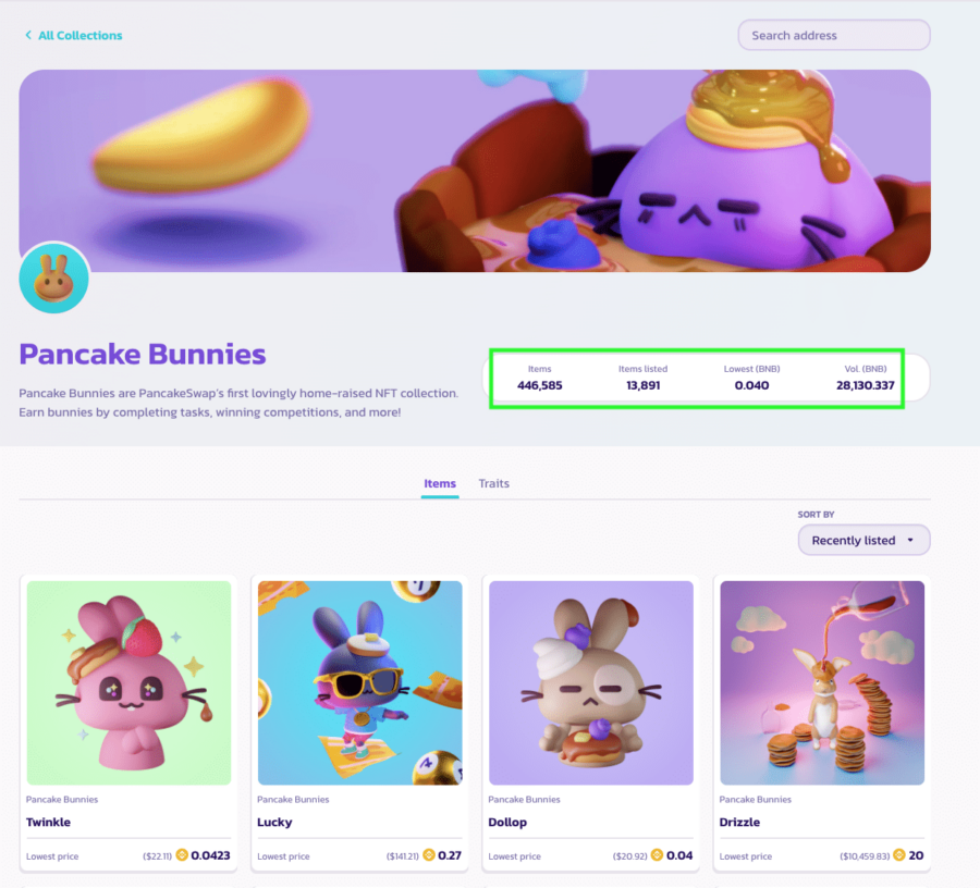 The first collection I want to find out more about are the Pancake Bunnies. Each collection has 4 main stats: number of Items, Items listed, Lowest value and trading Volume (in BNB). Click on the Traits tab to see the bunnies sorted by rarity together with their corresponding prices.