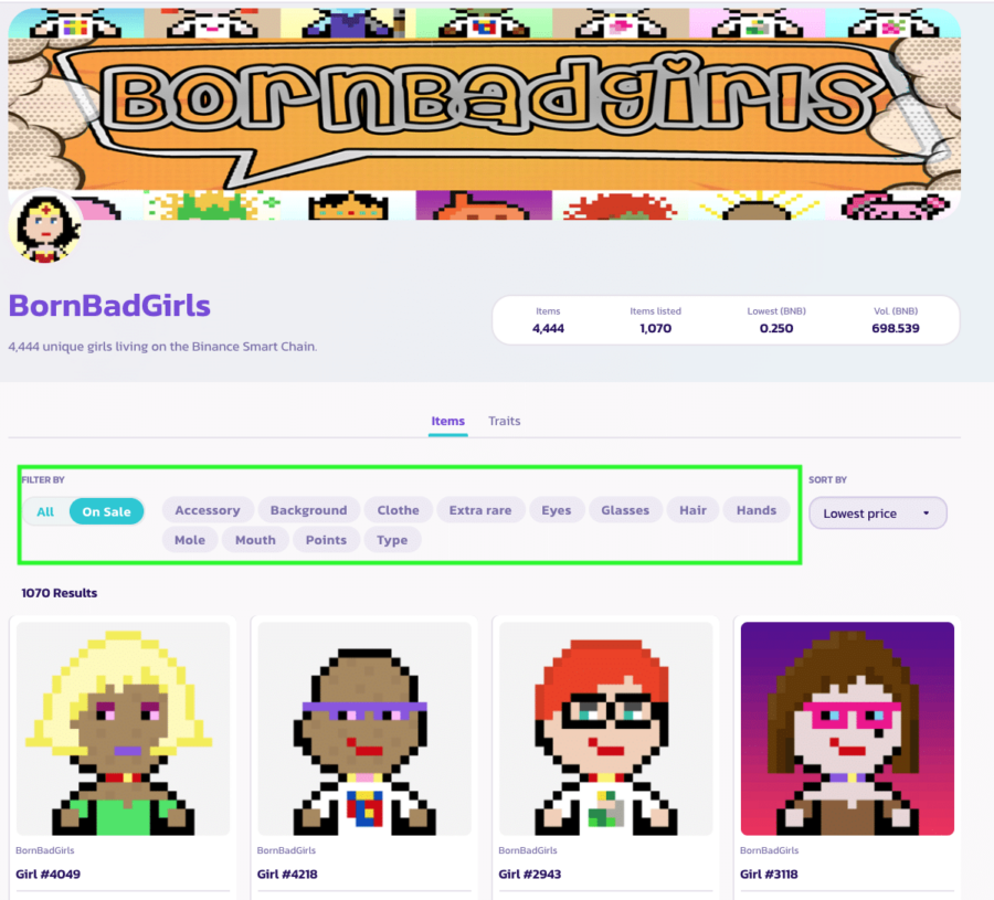 So here's where all the bunnies hang out... Why's that bunny worth 100BNB?! Other collections that are more similar to the CryptoPunks style can be filtered by other characteristics such as hair, eyes, accessory etc. Here's an example with BornBadGirls (yeah, girls rock!).