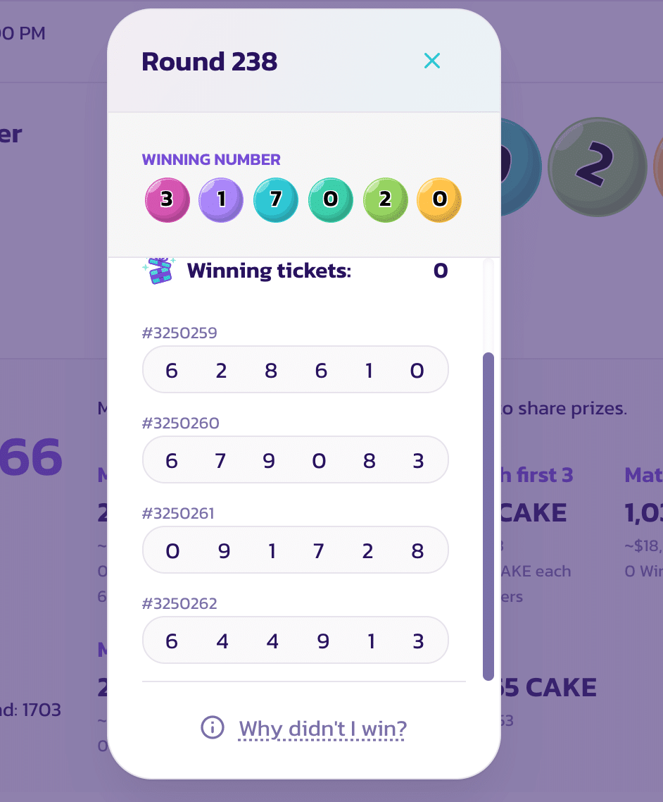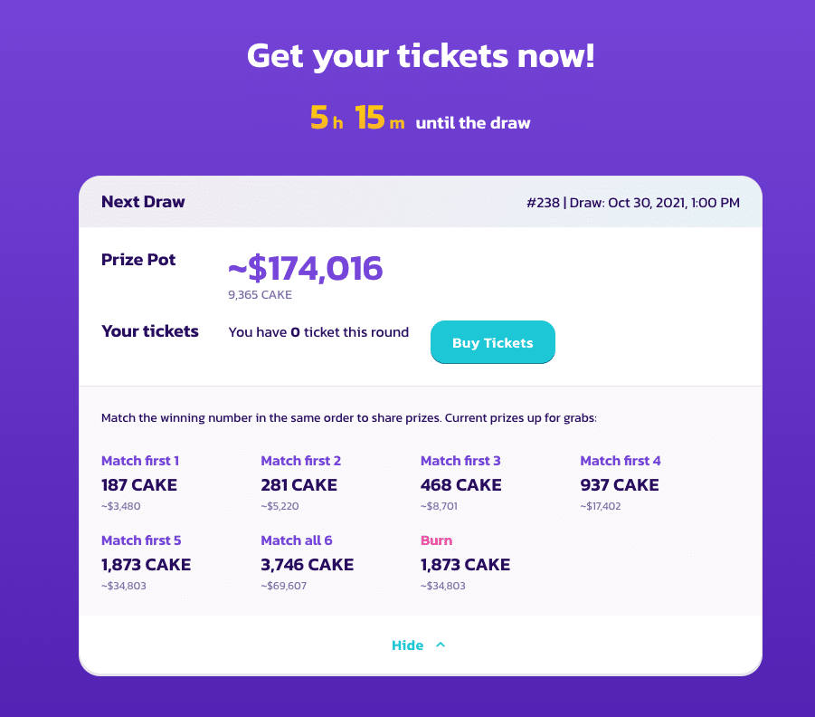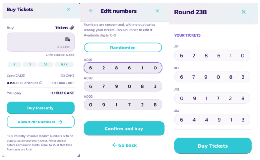 - Each ticket costs about USD5 in CAKE tokens. You get a discount for buying more.