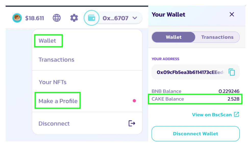 Hover the mouse over your wallet connection and go to "Make a Profile". You can also check your wallet to see how many CAKE tokens you have.