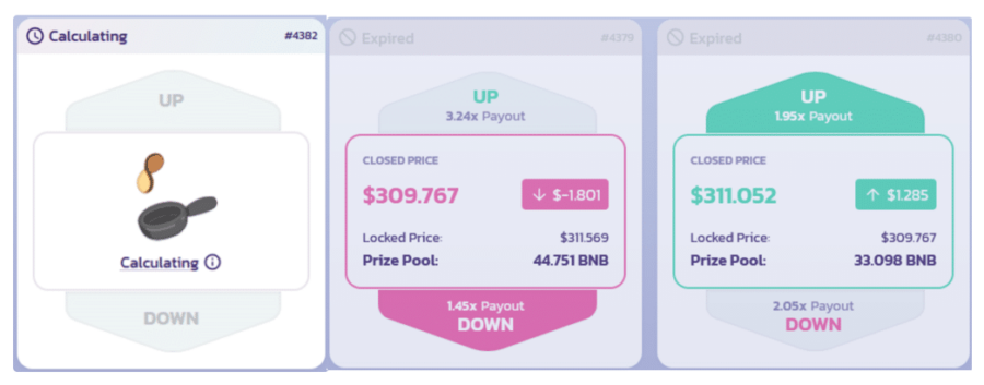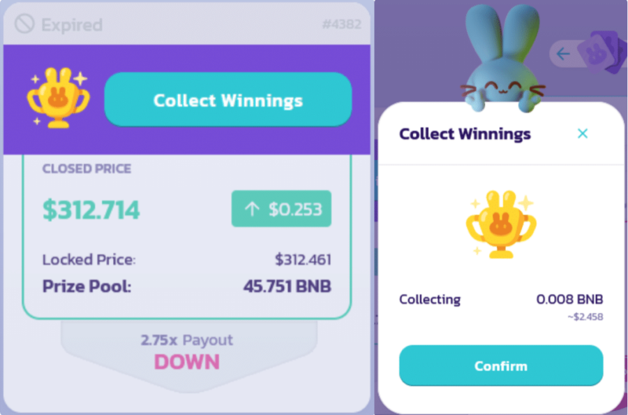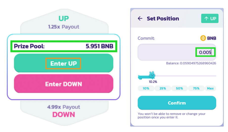 Make predictions before time runs out Each pool carries different level of rewards known as reward multiplier. This changes based on people's predictions, reflected in the "Prize Pool", just above the buttons. Let's go with UP. This brings up a new window, asking you to "Commit" some BNB to back up your prediction. Enter, click the percentage button or slide in your bets. Click Confirm when you're satisfied.