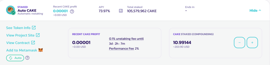 Take note of the 0.1% unstaking fee if you change your mind within 72 hours every time you manually deposit tokens to the pool. There is also a 2% performance fee for every withdrawal made, which they call yield harvest. CAKE tokens collected from these fees are burned to keep the token deflationary.