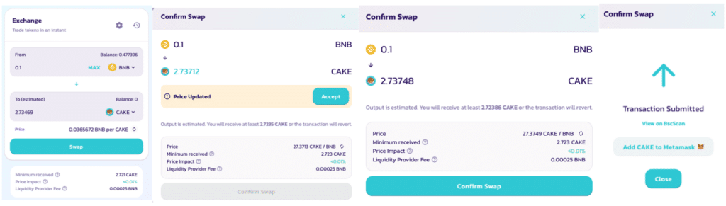 Let’s say you want to swap 10 CAKE tokens for BNB. The price per CAKE token is $18.50. With a 0.5% slippage, you accept the price range of $18.40 - $18.59. Any transactions beyond that range won’t get put through.