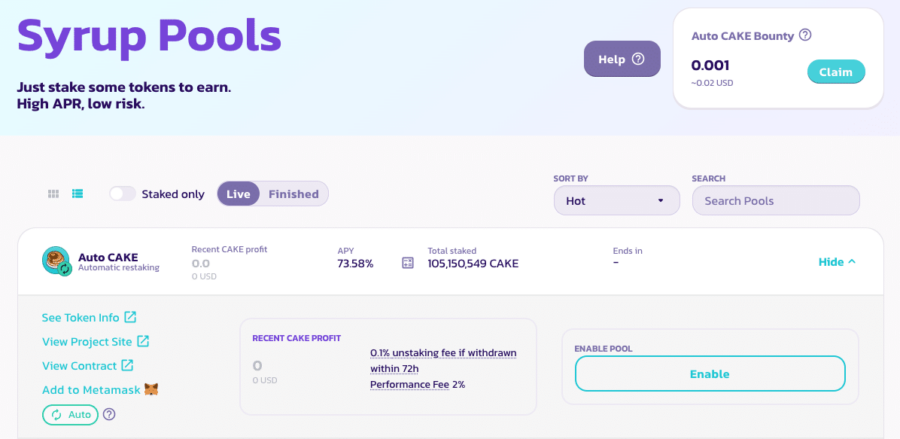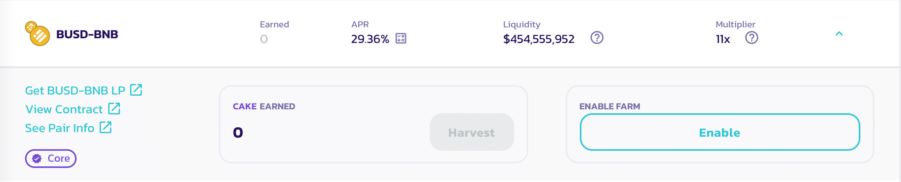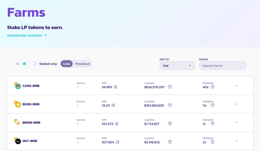 We have a list of the farms available to earn more money from. What you’ll earn is the CAKE token. The main factors affecting the rate of exchange include the annual percentage rate (APR), liquidity, and Multiplier. Hover the mouse over the mini Help icon for a description of the Multiplier which mainly deals with the number of CAKE tokens produced in this farm. You can also sort the list by Hot, APR, Multiplied, Earned and Liquidity metric in the Sort By dropdown list. If there is a particular farm you’re looking for, put in the LP token in the Search section.