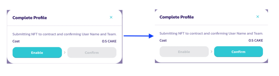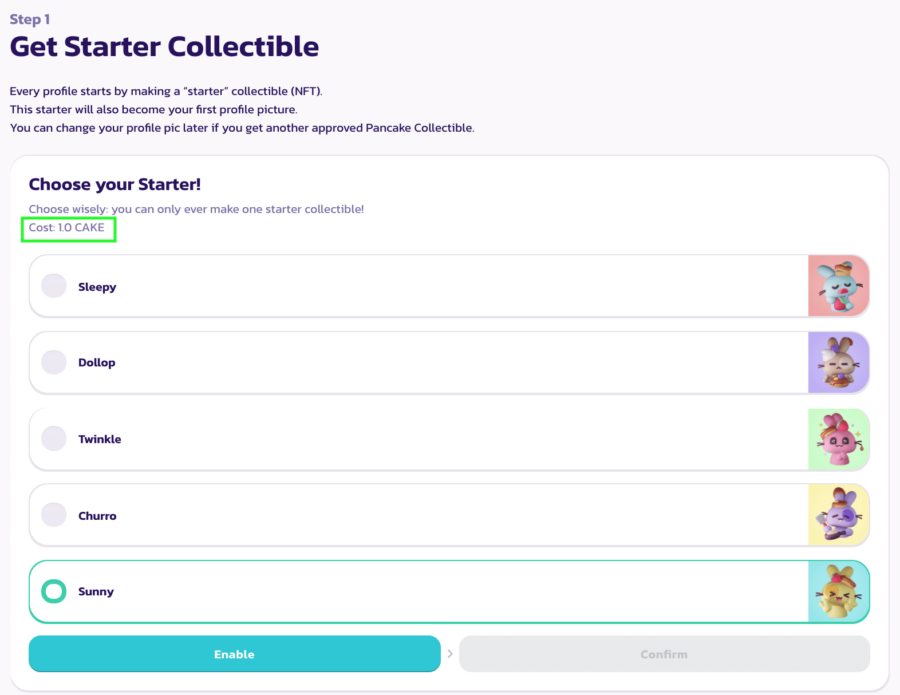 Because this is a beginner NFT, the cost is fairly low at 1 CAKE. When you're happy with your choice, click the Enable button to pay the transaction fee. Once paid, the Confirm button lights up allowing you to mint the NFT. Click Confirm to mint the NFT and pay the gas fee.