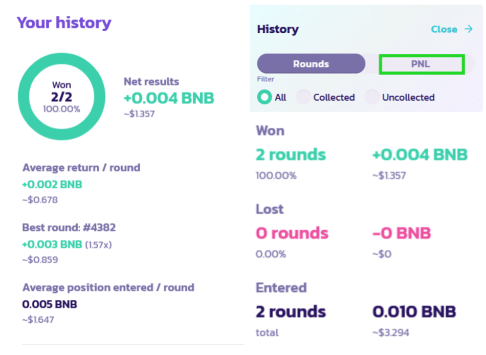 If you have done more than your fair share of predictions and want to know what your track record looks like, click on the PNL tab in the History window. You'll see some stats to give you an idea how (un)successful you were. Perhaps these stats can help you up your game in the future?