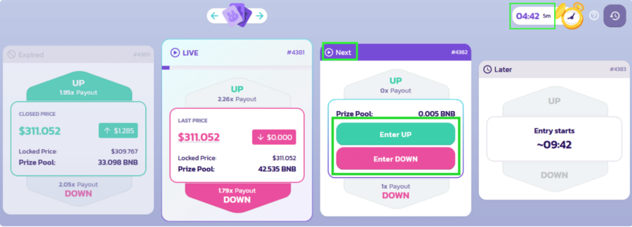 Before you begin, check the timer in the top-right area. Make sure you have plenty of time left before making a prediction. Give yourself at least a minute or so. Next, select "UP" or "DOWN" in the upcoming round marked "Next".