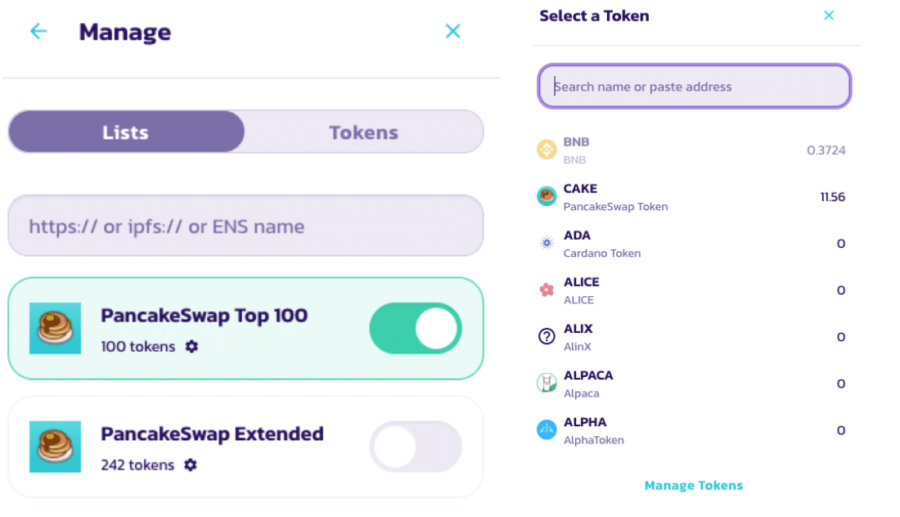 Choose the pair of tokens to swap If you want to see more tokens on the list, there is the option to add them through the Manage Tokens function. Selecting either the PancakeSwap Top 100 or PancakeSwap Extended would generally yield what you might be looking for. You can also import lists of tokens by its IPFS or ENS name.
