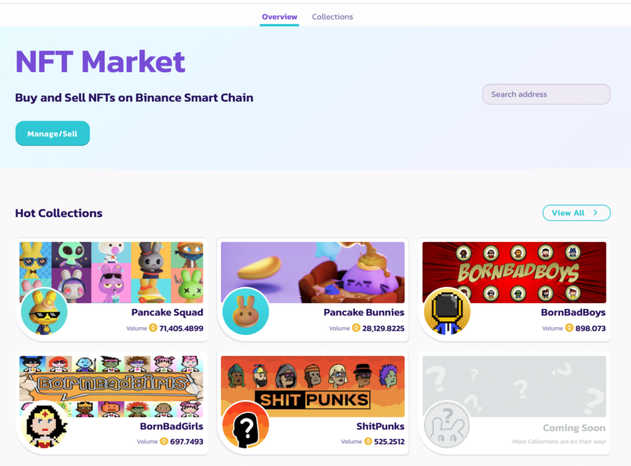 The main page gives you an idea of the kinds of NFT collections available in the market. These collections aren't exclusive by any means (most of them are on OpenSea), but you might be able to snag one at a good price here, especially for the ones designed by the PancakeSwap team.