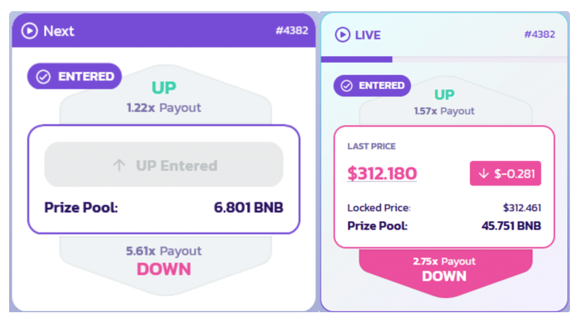 Place yer bets! There will be a short wait to ensure there is enough time to participate in the upcoming round. If successful, the "Entered" message will pop up. You're ready to go! You can watch the price update during the 5 minutes if you like. However, it is not possible to change your mind once your bet is in.