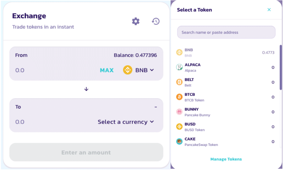 Exchange is for swapping one token for another. To swap, the top section is what the token you want to get rid of. The bottom section is the token you want to acquire. By default, the protocol displays tokens only on the Binance Smart Chain.