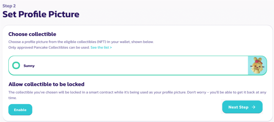Time to get my grubby hands on a bunny! Set your Profile Picture with the newly-minted NFT by clicking the Enable button which triggers another transaction fee. Once paid, the Next Step button lights up.