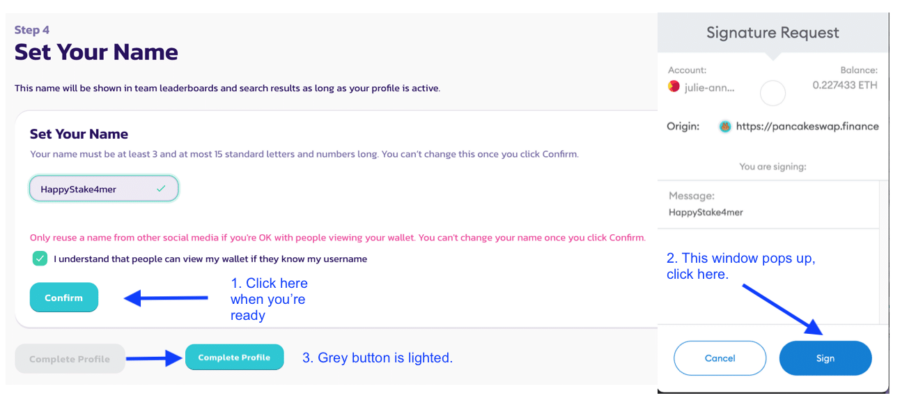Pick a name you like. Click the Complete Profile button to Enable and Confirm this transaction.