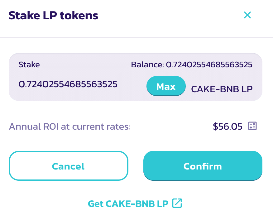 Yummy Syrup that makes CAKE taste soo much betterOnce enabled, I click the Stake button and am greeted with a pop-up window asking for input. While it's possible to type the amount I want, it's just a lot more fun using the bunny slider, which was what I did. Based on the amount intended for staking, the platform calculates the annual ROI at current rates.