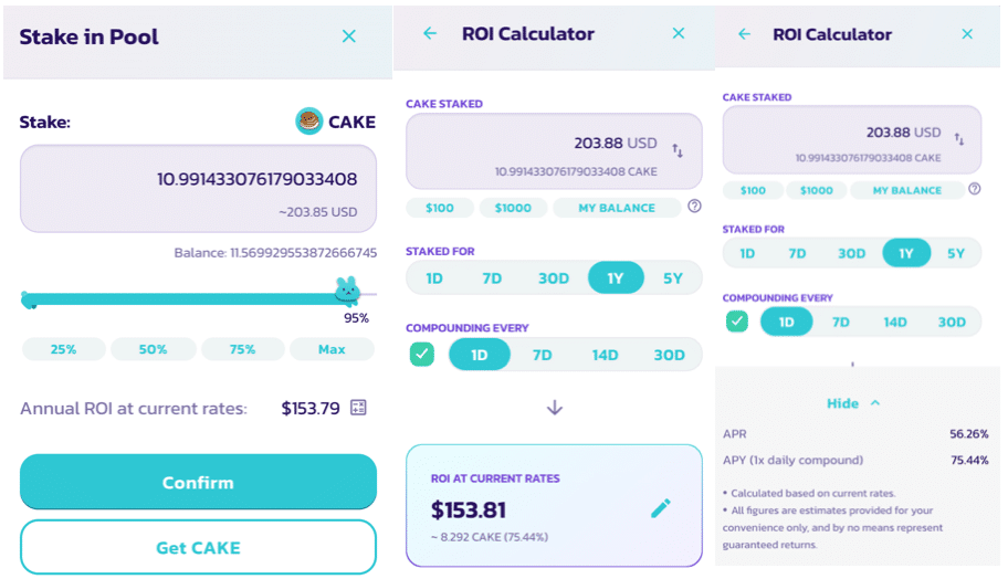 - Stake the CAKE in the Auto CAKE Syrup Pool for gain. This is practically free money. Use the ROI Calculator to figure out how much you can get as rewards based on current APR. Some other tokens might give you insane APR but those are usually quite unstable so unless you're the type whose eyes are glued to the page more than you spend sleeping, CAKE is a much safer bet.
