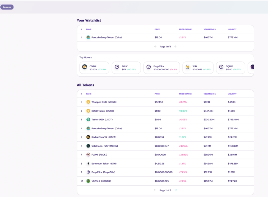 Just like the Pools section, this area is all about the tokens. Individual stats for each token including the pools that use them and transactions are also visible here. Current top movers are also shown here.