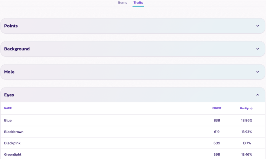 All traits individually sorted by rarity. Clicking on the individual bunny (ahem, item/character) gives you some detailed stats and who's selling in case you'd like to buy from them, as opposed to buying it directly from the platform. However, it doesn't mention the reason for the rarity, which would be nice to know. It is possible to find out based on analysing the traits but that's a roundabout way. My best guess is the low supply count number.