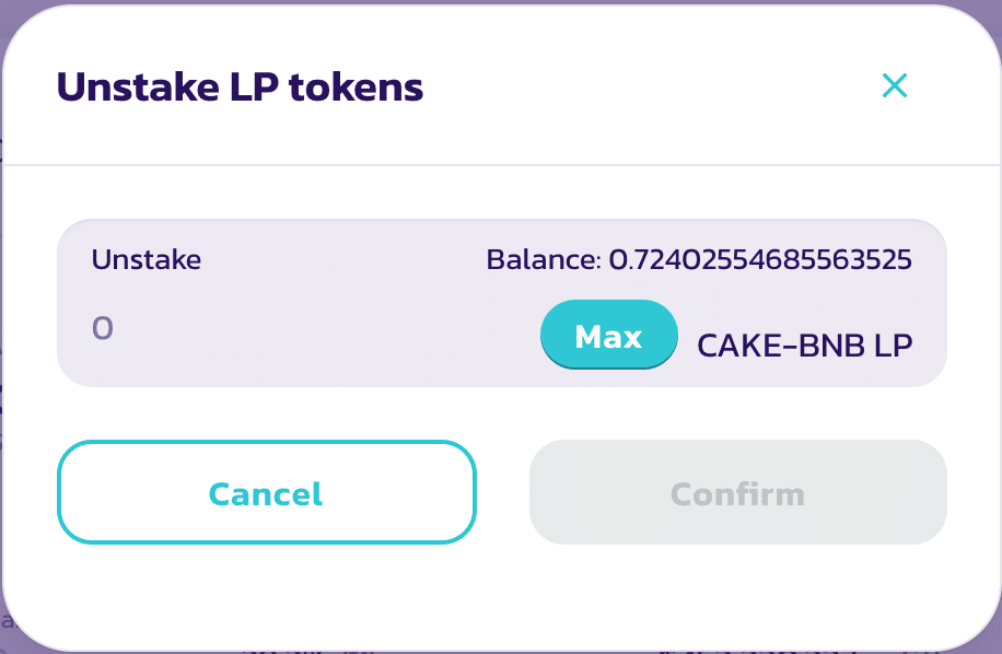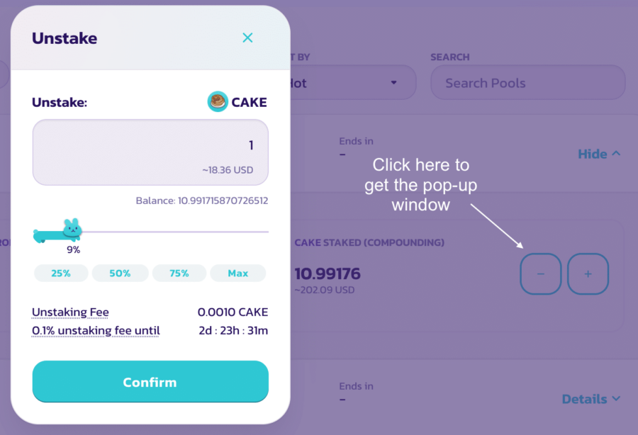 Getting out is also easy. Simply click the '-' button and enter / use the bunny slider to key-in how much you want to take back. The Unstaking Fee is calculated in CAKE. Click Confirm to continue.