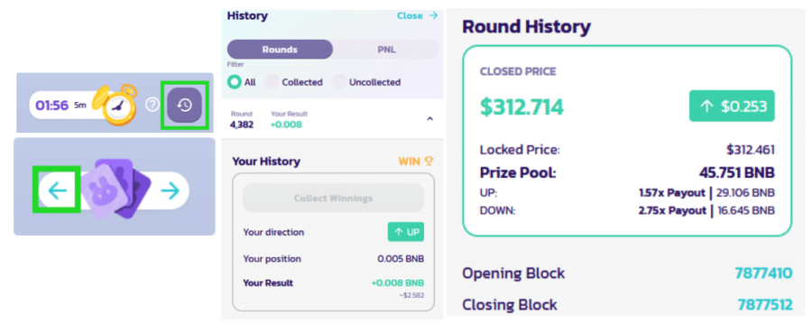 Click on the left/right arrows next to the bunny icon or the icon next to the timer. The "History" panel pops up with information on the most recent round together with any winnings you might be eligible for. Click on the round for more information.