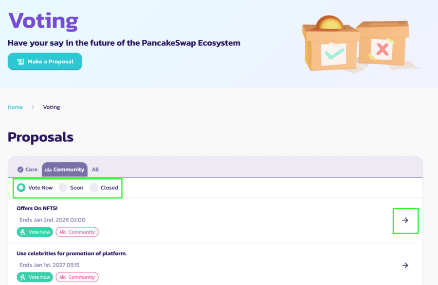 There are two kinds of proposals to vote for: Core and Community. Each kind comes with three statuses: Vote Now, Soon and Closed, ie past proposals.