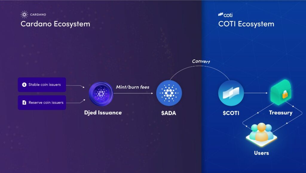 A Look at how the Cardano and COTI Ecosystem Interact. Image via CardanofeedAs I am no math whiz and the technical specs of this project are far above my head, I guess I will just have to take IOG’s word for the claim that the Djed protocol is mathematically certifiable. As it is an algorithmic stablecoin, it does not require a bank license to issue, unlike centralized stablecoins. Smart contracts ensure price stabilization and automatically issue more coins as the price increases, or buys more when the price falls, helping to stabilize the price. A reserve of base coins is kept to help ensure a stable price in the event the peg falters.