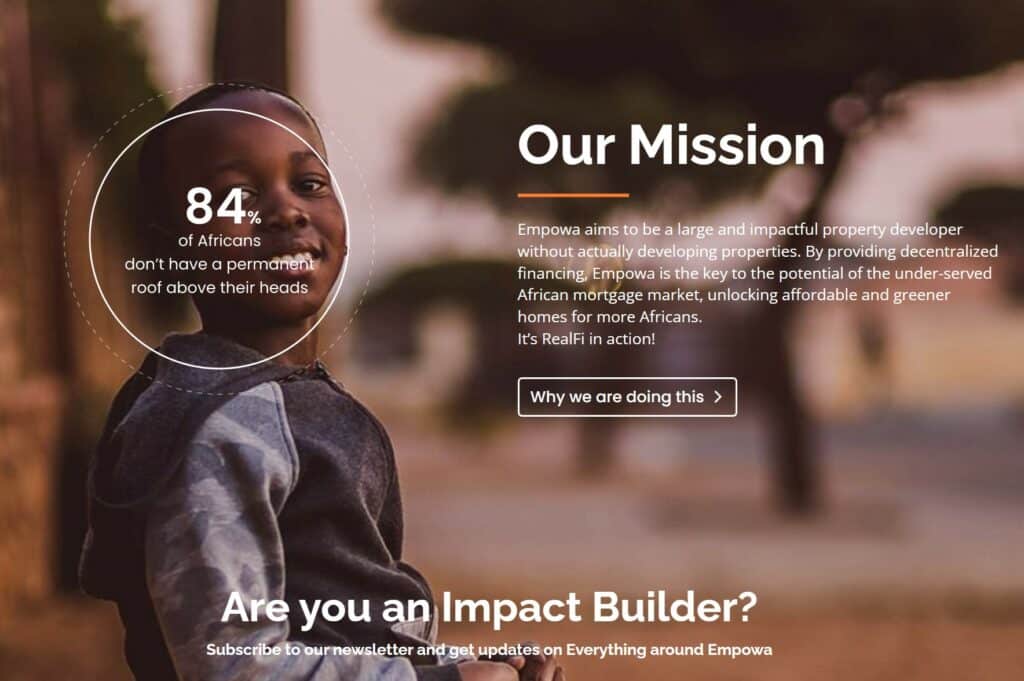 A Look at the Empowa homepageEmpowa is the first RealFi property platform on Cardano that combines emerging technology, sustainable building, and decentralized financial inclusion for all. Empowa is on a mission to provide affordable housing and banking services for those without access to such services in Africa.