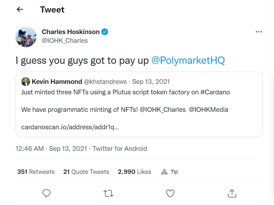 The community has gotten so used to projects missing their deadline targets that Polymarket, a popular crypto news and analytics platform, had publicly and humorously bet against Hoskinson, betting that smart contracts and dApps wouldn’t be deployed on Cardano by the end of the year. The lost bet resulted in Polymarkets donating funds to a Charity of Hoskinson’s choice.