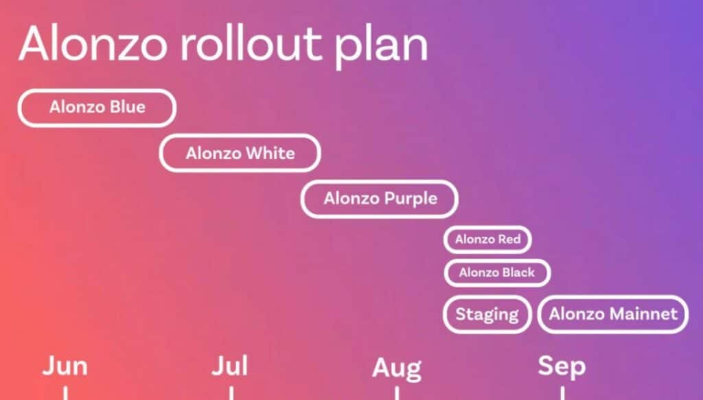Alonzo Purple was the fully public testnet, which saw the onboarding of thousands of participants onto the network. This stage was split into “light purple” and “dark purple,” the first of which supported simple smart contracts, and the second allowed for complex smart contract transactions.