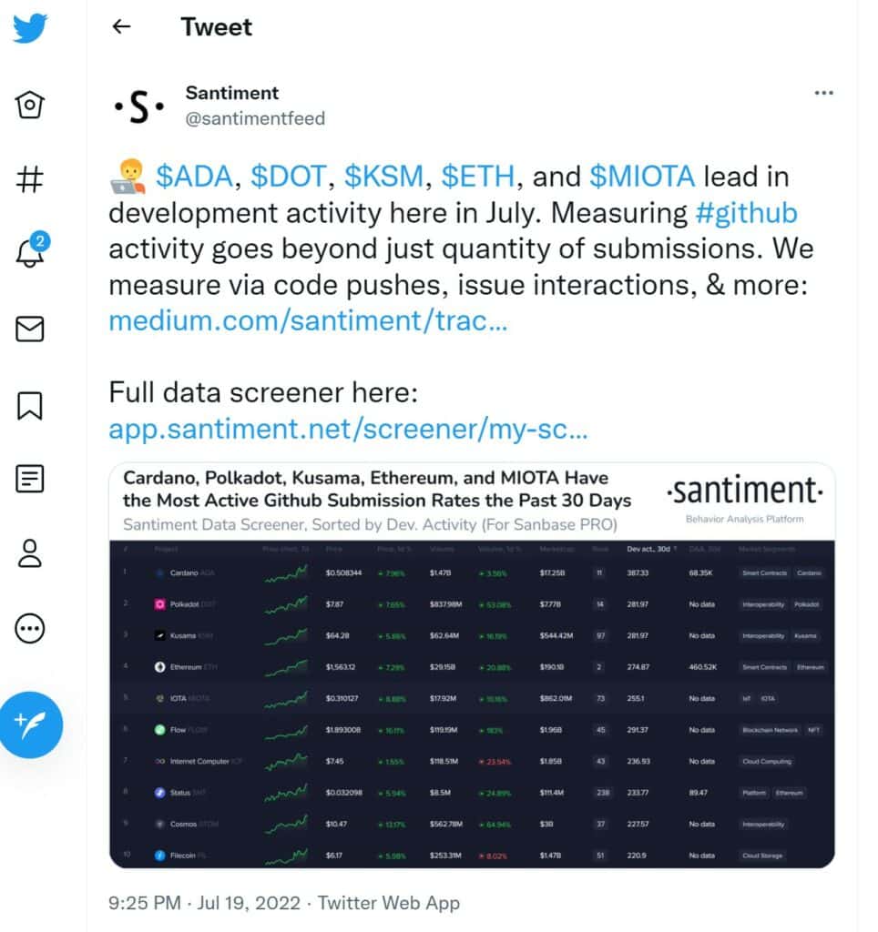 In July 2022, Cardano Led in Developer Activity. Image via Twitter/SantimentAs many people in tech and crypto say: “follow the developers,” because where development is happening, things are being built that are likely to attract users and investors.