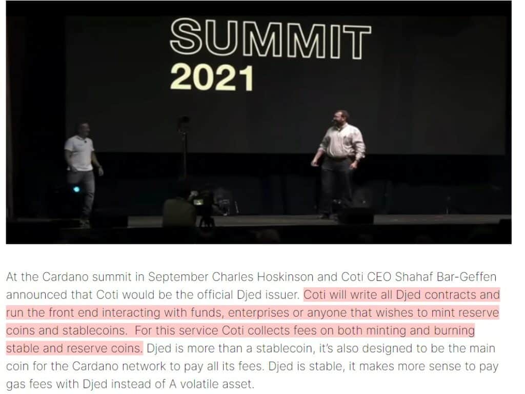 COTI CEO Bar-Geffen and Hoskinson Announce Djed at 2021 Cardano Summit. Image via adapulse.ioThe COTI MultiDAG built on top of the Trustchain produces fiat-collateralized, crypto-collateralized, non-collateralized, and other stable currencies that can be created by organizations, which is where Cardano’s Djed comes in.