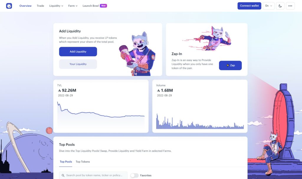 - Launchpad- The Launchpad supports new projects on Cardano by offering the community access to Initial DEX Offerings (IDOs) and Initial Farm Offerings (IFOs).