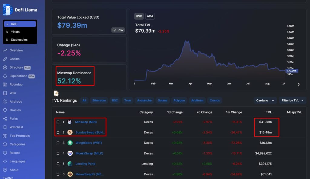 MinSwap is holding over 52% Dominance on the Cardano Network according to Defi LlamaMinSwap has over double the TVL as the second largest DEX, and its dominance only appears to be growing. MinSwap aims to be the #1 liquidity provider in the market by integrating the best asset pool models from across the entire DEX ecosystem into one protocol.