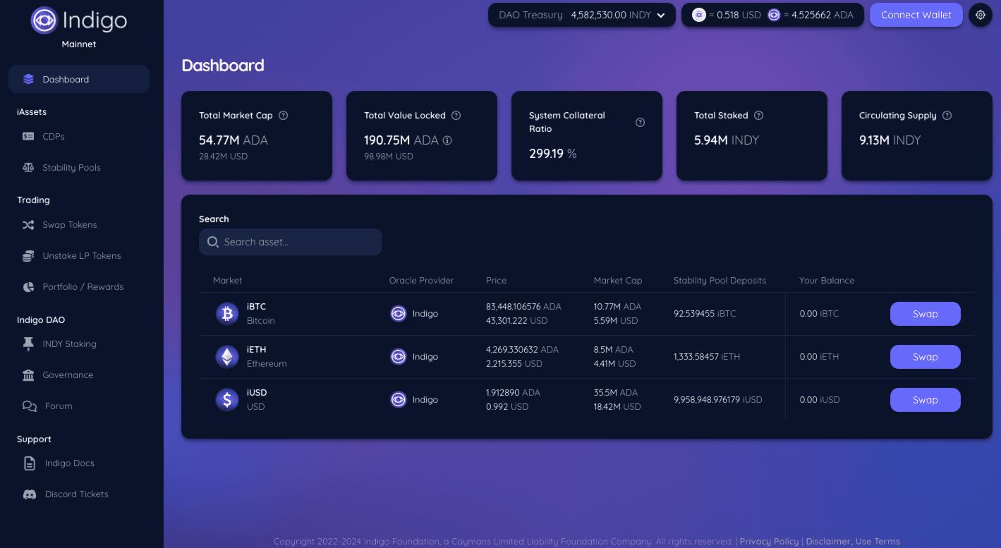 A Look at the Indigo DashboardiAssets are digital assets in the cryptocurrency realm whose values are determined by monitored assets. Unlike wrapped assets linked via a bridge to deposits on another chain, iAssets rely on a price Oracle to monitor the value of the underlying asset. A prime illustration of an iAsset is iBTC, which emulates a synthetic version of Bitcoin (BTC). Its purpose is to replicate the price movements of BTC, an asset existing in an ecosystem external to Cardano.