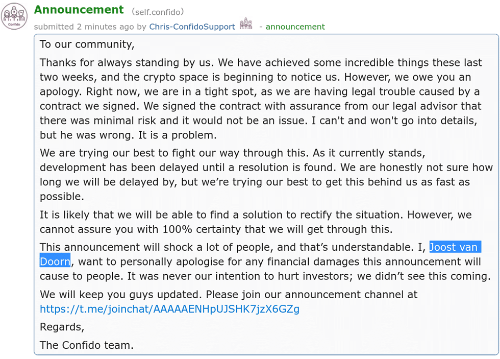 In a since deleted announcement published Sunday, November 19th, Confido’s devs made a stunning revelation: the project was in dire straits legally.
