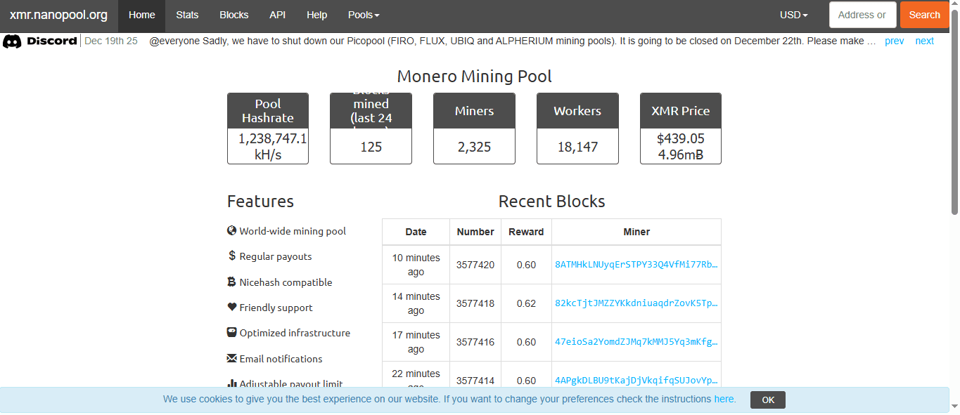 A Snapshot of Nano Pool. Image via NanopoolNano Pool is best for multi-coin miners with established workflows. A veteran platform since 2016, NanoPool supports over 40 algorithms alongside XMR.