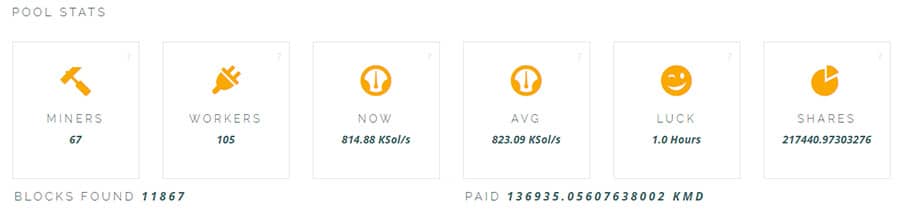 Suprnova.cc KMD Pool and Mining StatisticsSuprnova.cc has the standard 1% mining fee and a nice low 0.1 KMD minimum payout. They hold about 15-20% of the total hashing power, making them a good choice if you want a solid pool that isn’t endangering the decentralization of the network.