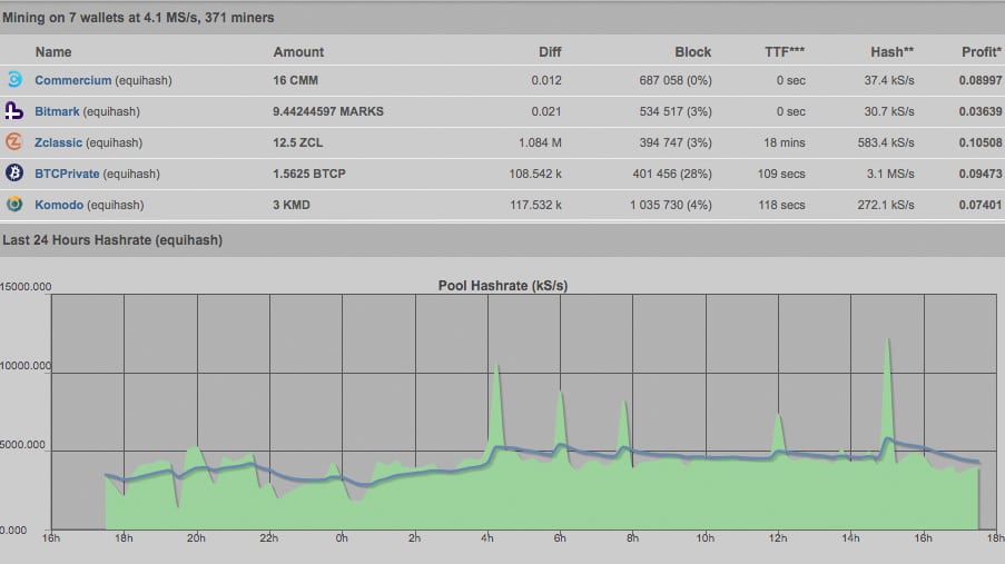 Zpool Equihash Pool StatisticsNote that with Zpool you choose the algorithm (Equihash in the case of Komodo) and Zpool decides which coin in the algorithm is most profitable to mine. This means you might not be mining Komodo at all times. It also means the hashing power of Zpool varies dramatically as a percent of the total. I’ve seen it below 10% of the total and above 70% of the total. Keep that in mind regarding centralization when you’re deciding which Komodo pool to use.