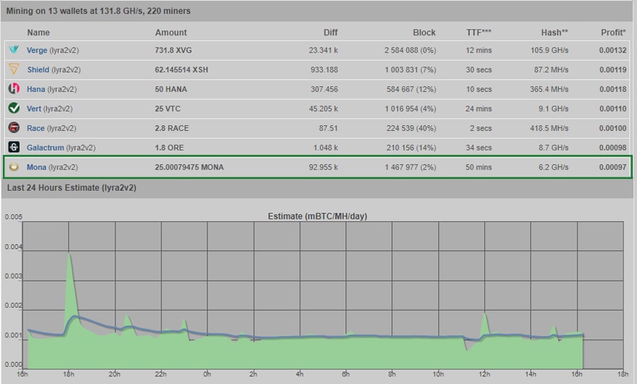 They currently only guarantee BTC payments, and you can mine Monacoin, but get paid in Bitcoin if you like. Note that with Zpool you choose the algorithm and Zpool decides which coin in the algorithm is most profitable to mine. This means you might not be mining Monacoin at all times if you’re mining Lyra2REv2 because there are 13 different coins with that algorithm and Monacoin is rarely the most profitable.