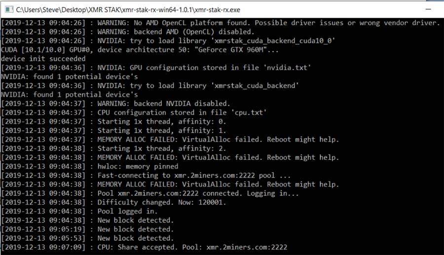 Step 9: Don't RebootAnd in the second window, you should see that you’re now mining. You may see several error messages, but eventually, the software will begin using your CPU to mine and will begin detecting blocks.