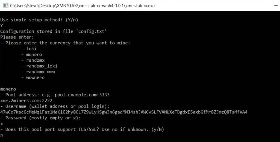 Step 7: Entering your XMR AddressNext, you’ll be asked if the pool supports TLS/SSL. If you’re unsure you can just type ‘n’ and press enter. If you’re using 2Miners like us you’ll want to type ‘n’.