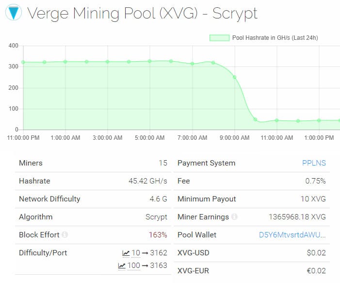 Coinfoundry XVG Scrypt Pool StatsIt also has a low 0.75% fee, which is better than most. There are servers located globally, and uptime is 100%. Other Scrypt mining pools for Verge include: