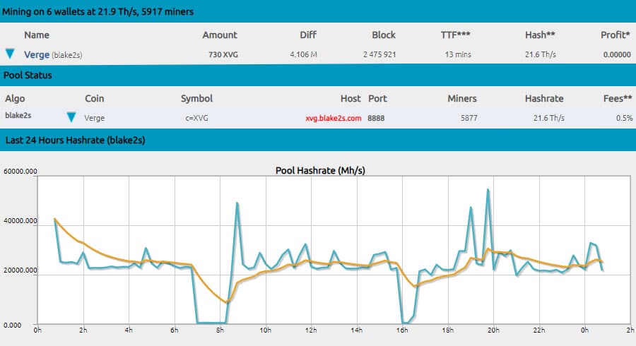 CryptoCartel Blake2S Verge Mining Pool StatsIt has a low 0.5% mining fee, and thousands of miners so you know there will be plenty of blocks found. There’s no registration required at the site, which maintains your privacy. If you want to mine somewhere else these sites also support blake2s Verge mining: