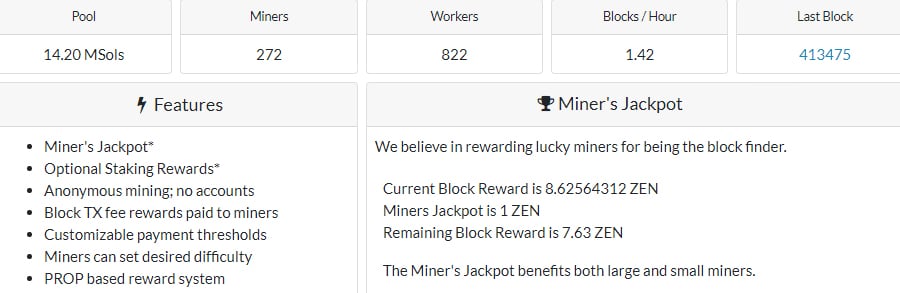 Luckpool.net is a Canadian based pool, so is best used by those located in North America. It is a bit different from other pools in that it charges a smaller 0.5% miners fee, but also offers something they call the Miner’s Jackpot. This is a bonus paid to the miner who actually finds the block. In the case of Horizen the Miner’s Jackpot is 1 ZEN. This leaves 7.63 ZEN to be shared among the other miners.