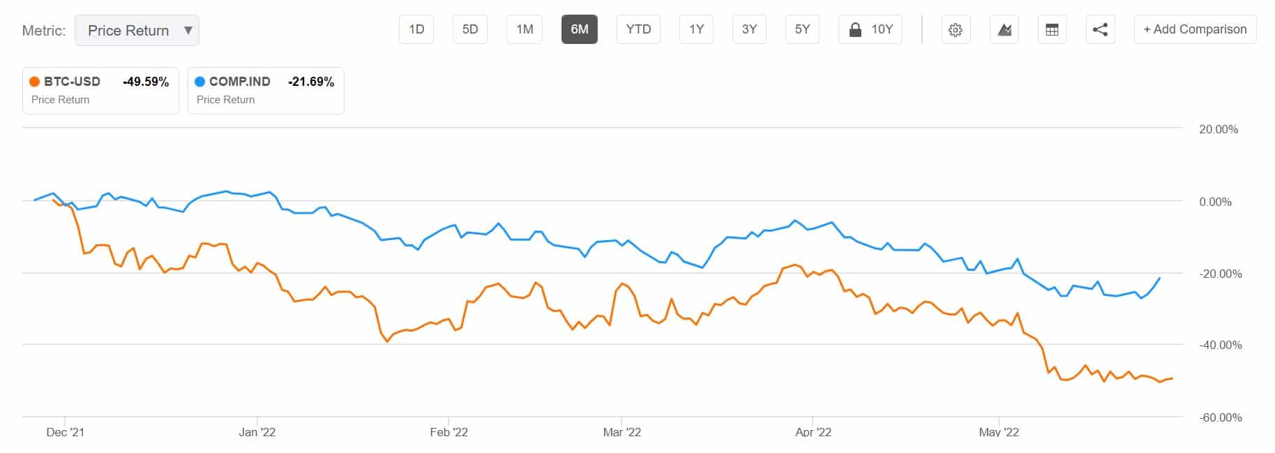 A Look at Bitcoin vs the Nasdaq composite index. Image via Seeking Alpha