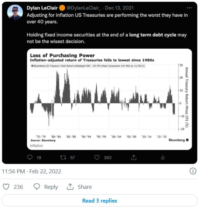 “Since November yields have been rising dramatically — bond investors begun to realize that w/ inflation at 40-year highs, they are sitting in contracts programmed to decline in purchasing power.”