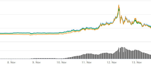 From Friday, November 10, to Sunday, November 12, Bitcoin Cash (BCH) had an astounding weekend price performance—surging all the way up past $2,400 in the early hours of Sunday before settling back down in the $1,200 price range at press time.