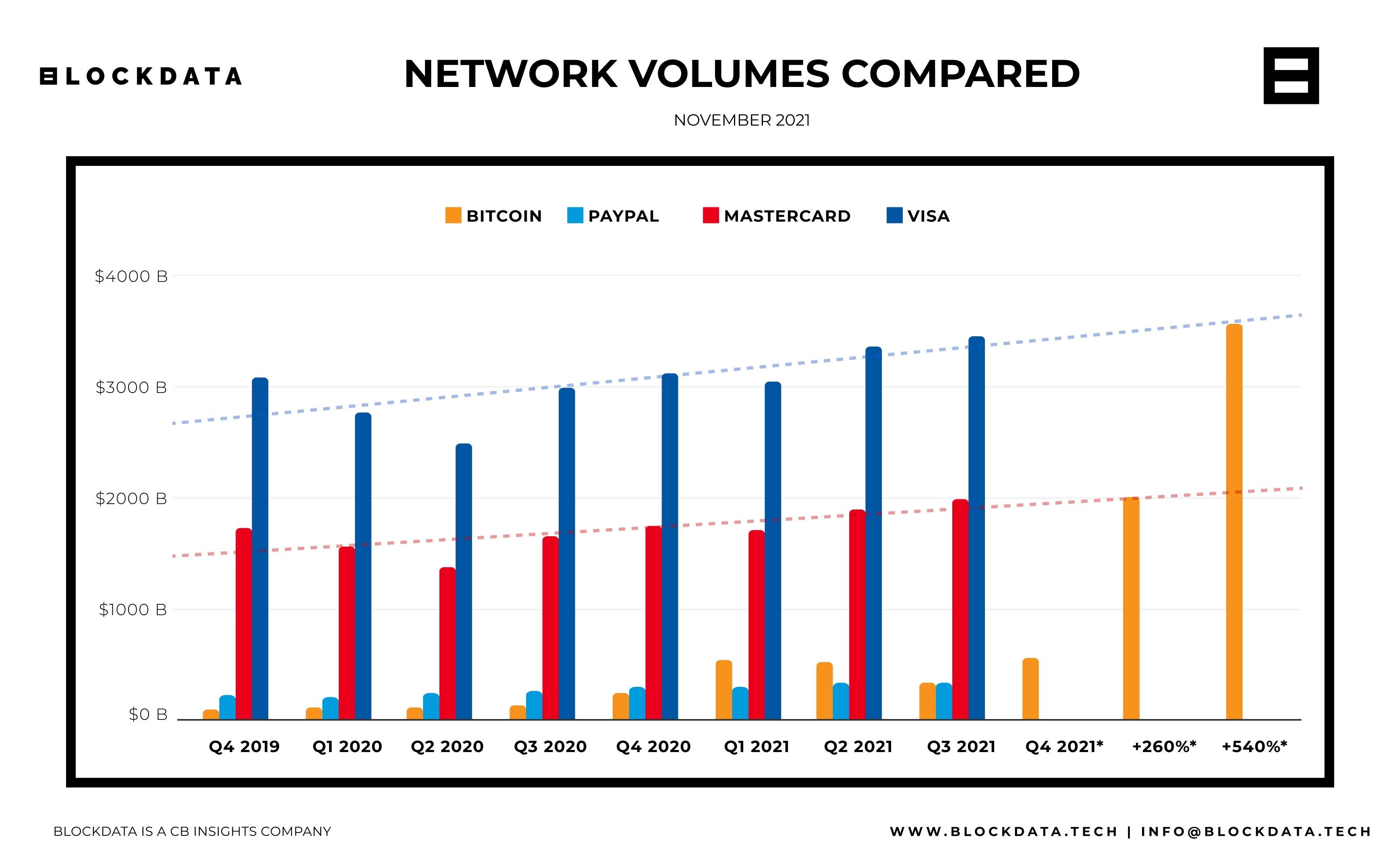 According to Statista, PayPal processed an average of $302 billion per quarter in 2021, while the Bitcoin network processed an average of $489 billion.